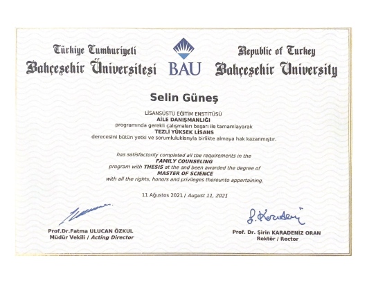 Yeditepe Üniversitesi Psikoloji bölümü mezunuyum. Bahçeşehir Üniversitesi Aile Danışmanlığı yüksek lisansını tamamladım. Kurucucusu olduğum Nova Vita Danışmanlık merkezinde online ve yüz yüze hizmet vermekteyim. Çocuklarla deneyimsel oyun terapisi ekolüyle çalışmaktayım. Deneyimsel oyun terapisi; çocuğu merkeze alan, koşulsuz kabulün olduğu, terapist ile güvene dayalı bir ilişkinin kurulduğu, çocuğun deneyimlerini, yaşantısını, zorlandığı yerleri oyun ile aktarmasına saygı duyarak alan tutan bir anlayıştadır. Bu ekolle; kaygı, korku, travma, tuvalet/uyku/yemek problemleri vb. çalışılabilir.